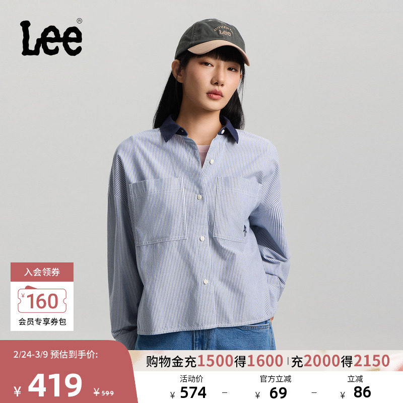 Lee26春夏新品宽松版仿牛仔布领口设计条纹海军蓝女长袖衬衫休闲