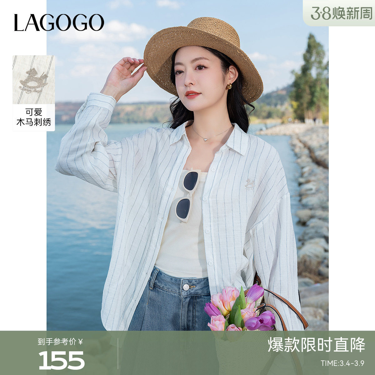 LAGOGO条纹宽松遮阳白衬衫女拉谷谷2025夏秋新款休闲轻薄长袖上衣