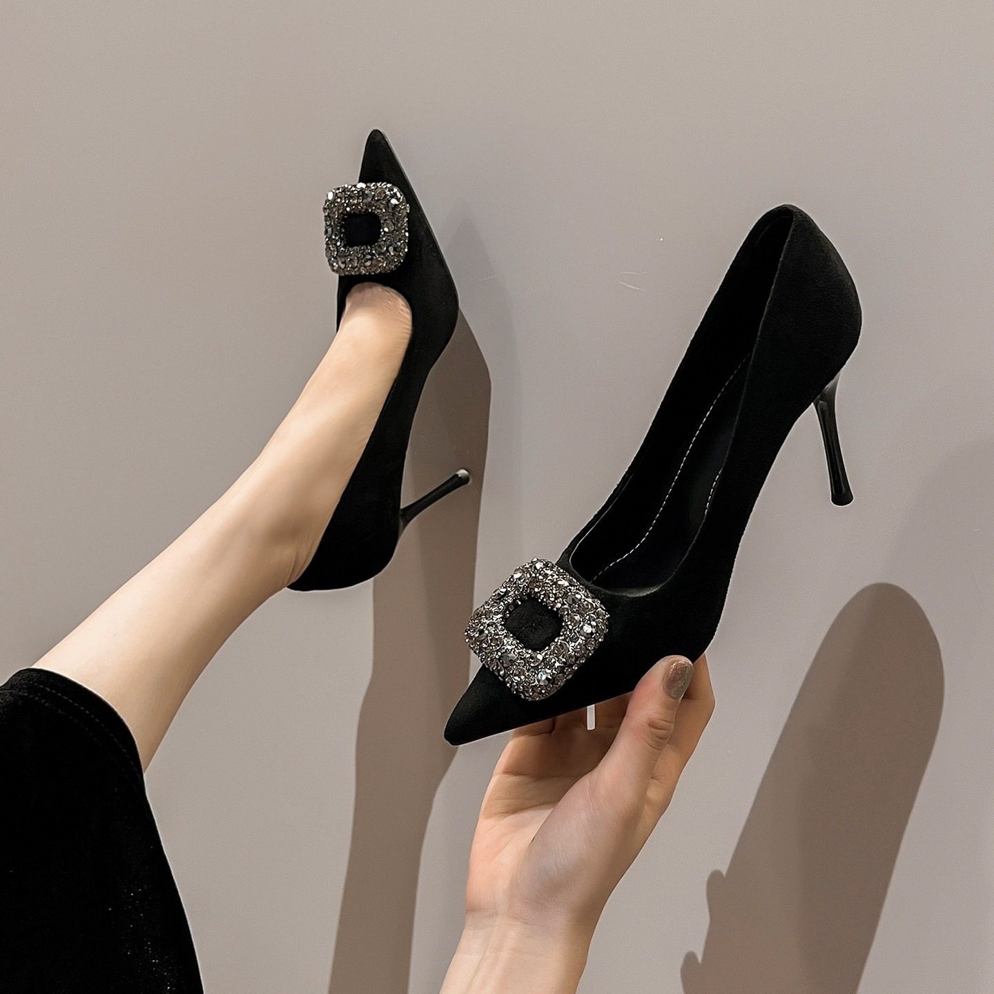 黑色高跟鞋女2025新款尖头羊猄绒水钻方扣百搭细跟软底单鞋配裙子