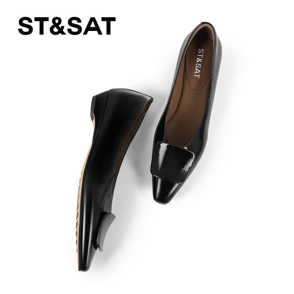 星期六棕色单鞋女2025方头浅口粗跟女鞋方扣气质通勤设计师工作鞋