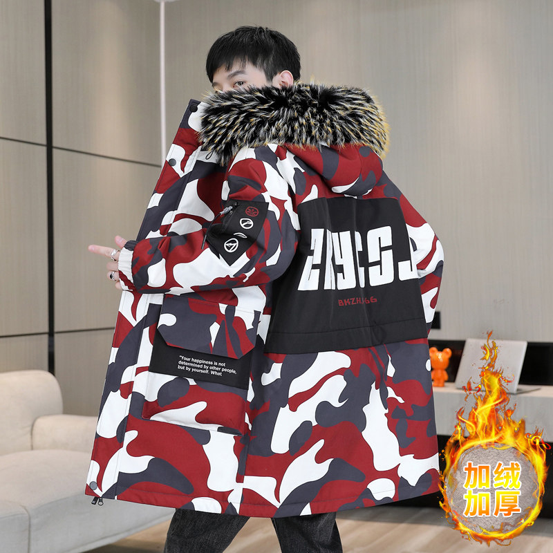 青少年迷彩棉衣外套男冬季初高中学生潮流加绒加厚中长款派克棉服