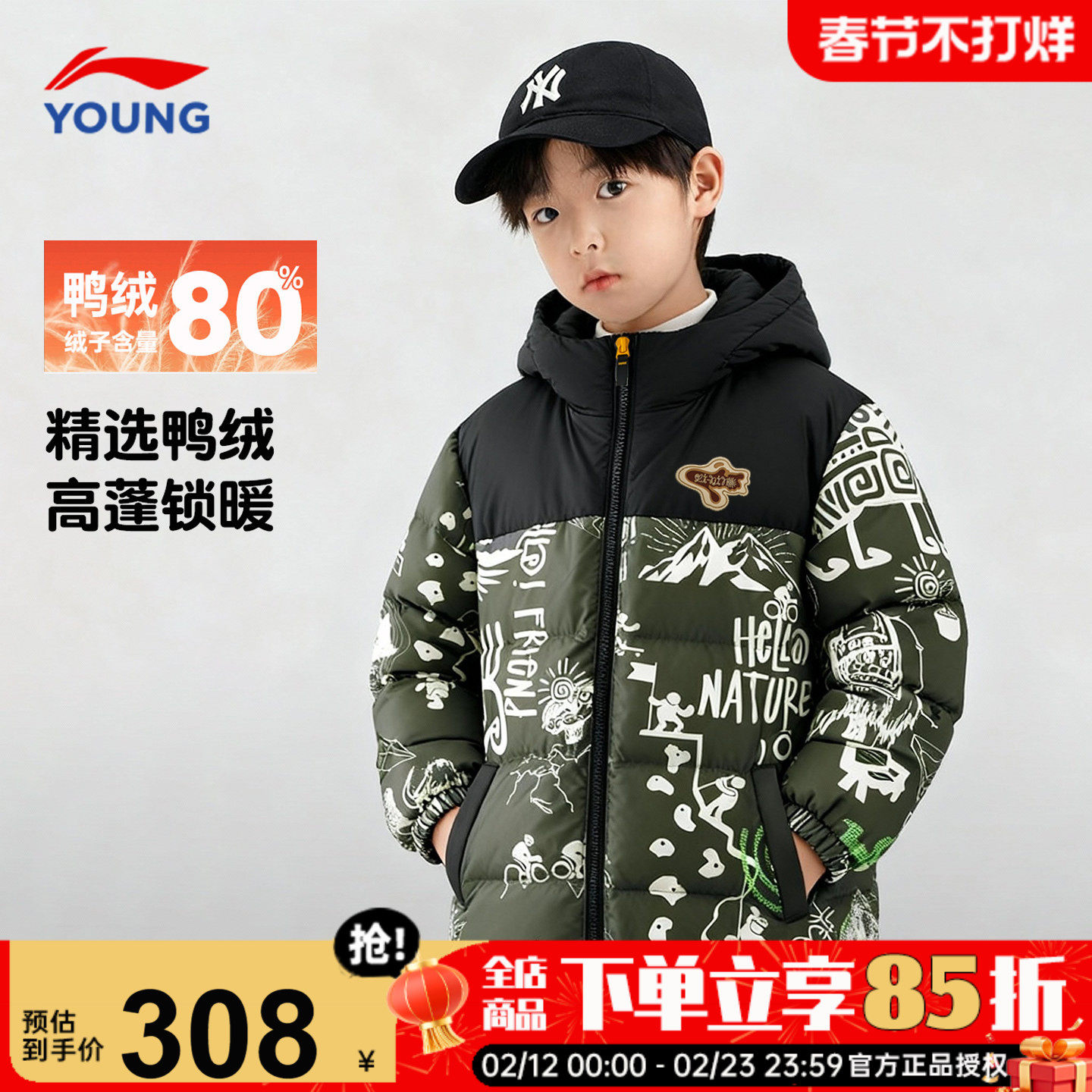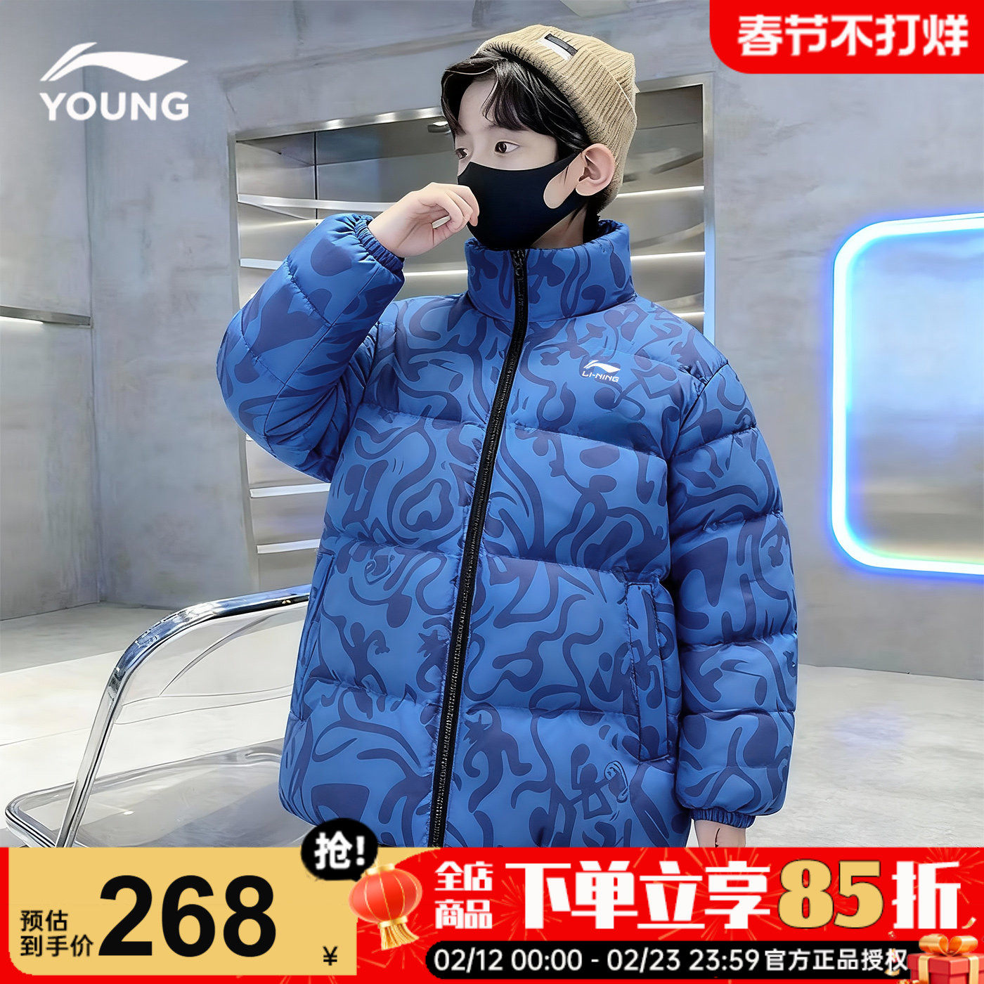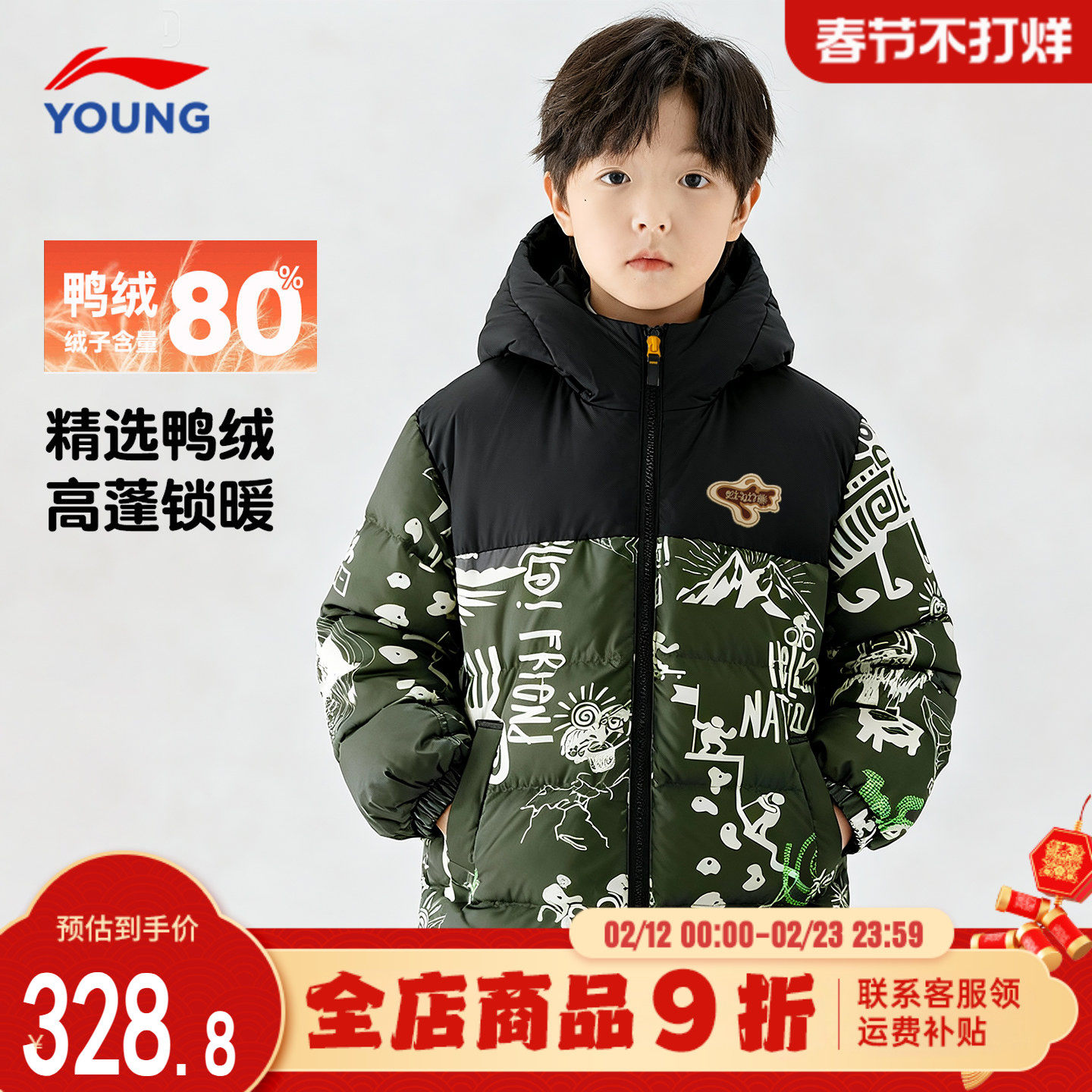 李宁男童羽绒服儿童冬季26新款正品中大童青少年迷彩加厚连帽外套