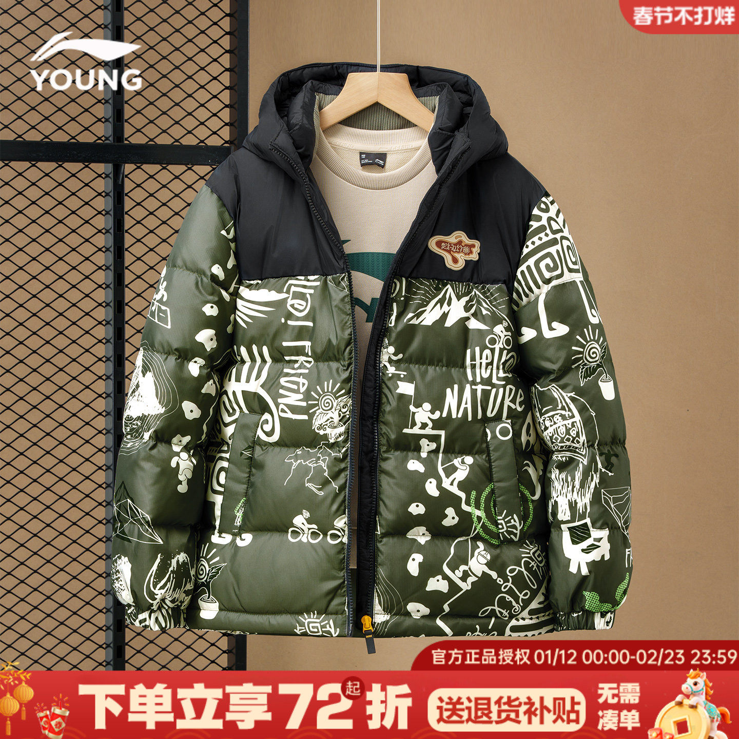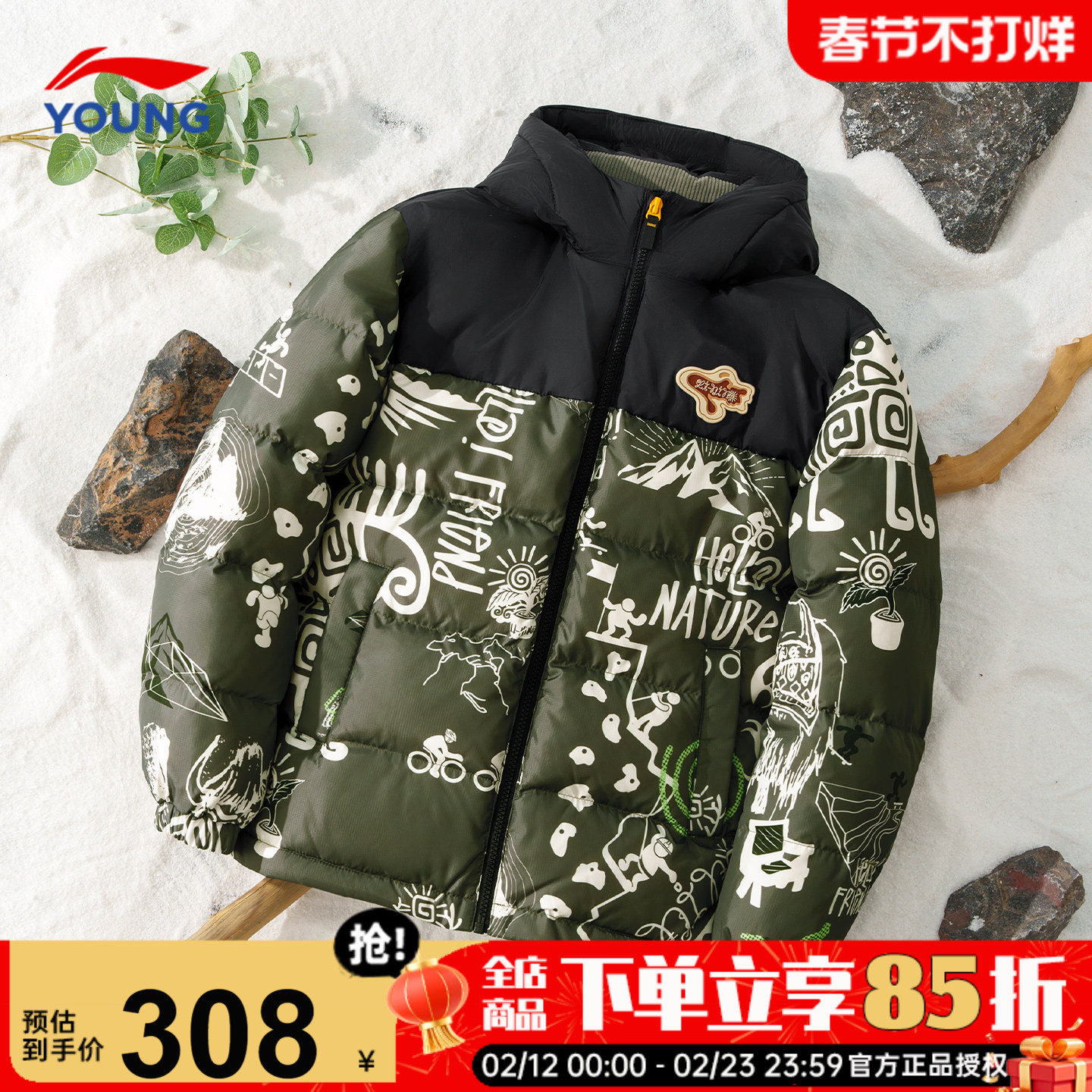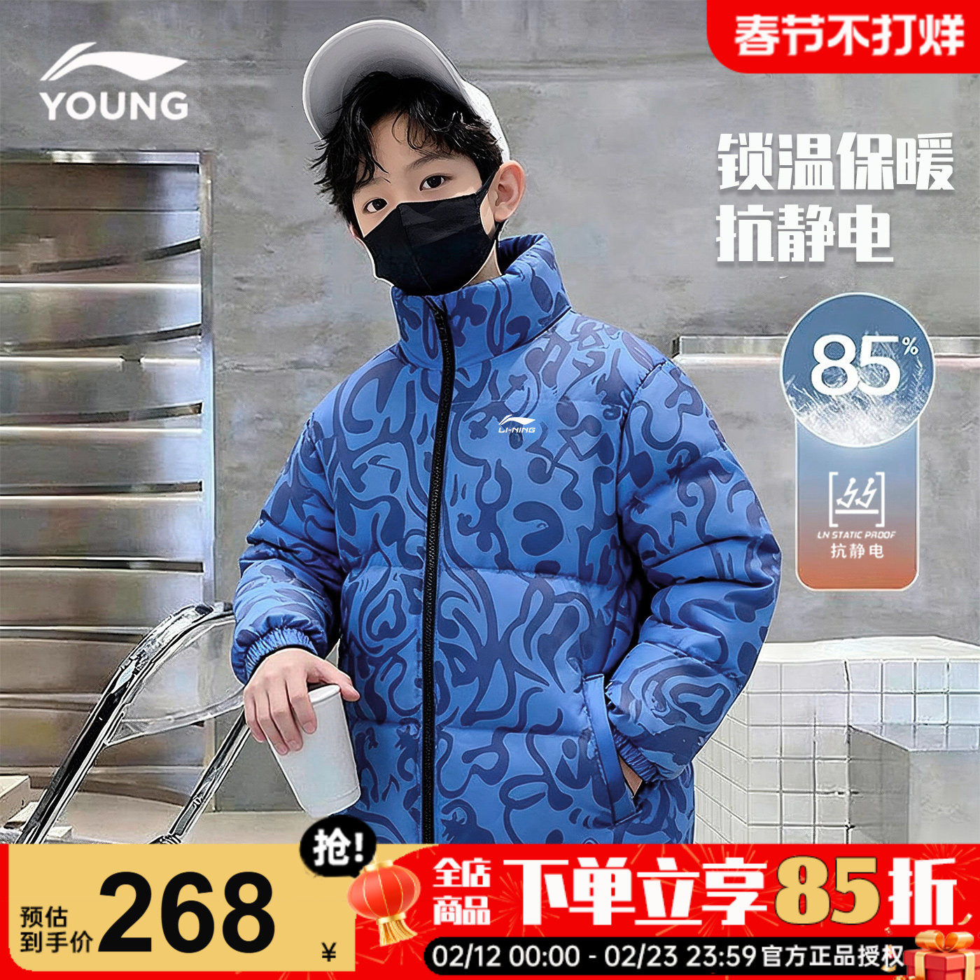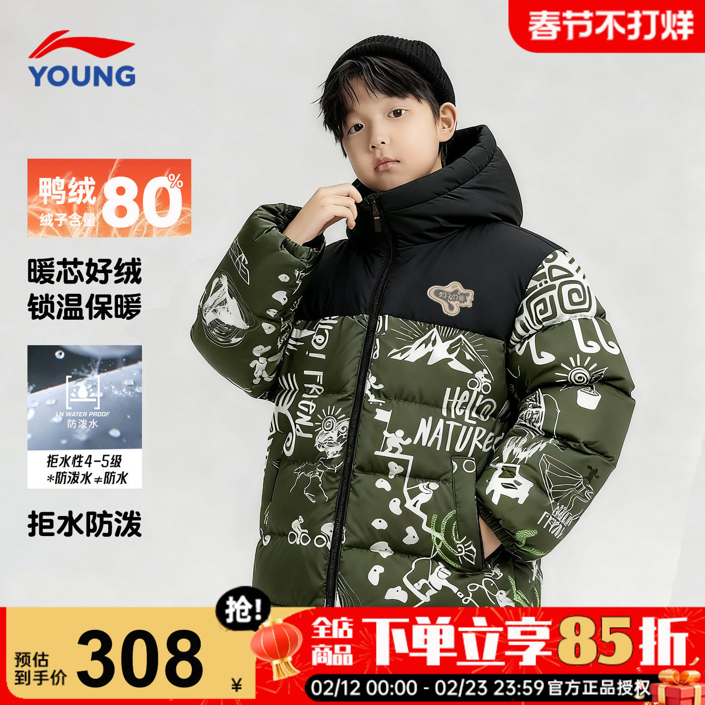 李宁男童羽绒服儿童冬季26新款正品中大童青少年迷彩加厚连帽外套