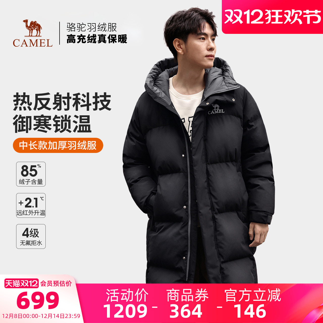 骆驼男装中长款羽绒服男款冬季户外加厚防风保暖鸭绒外套防水情侣