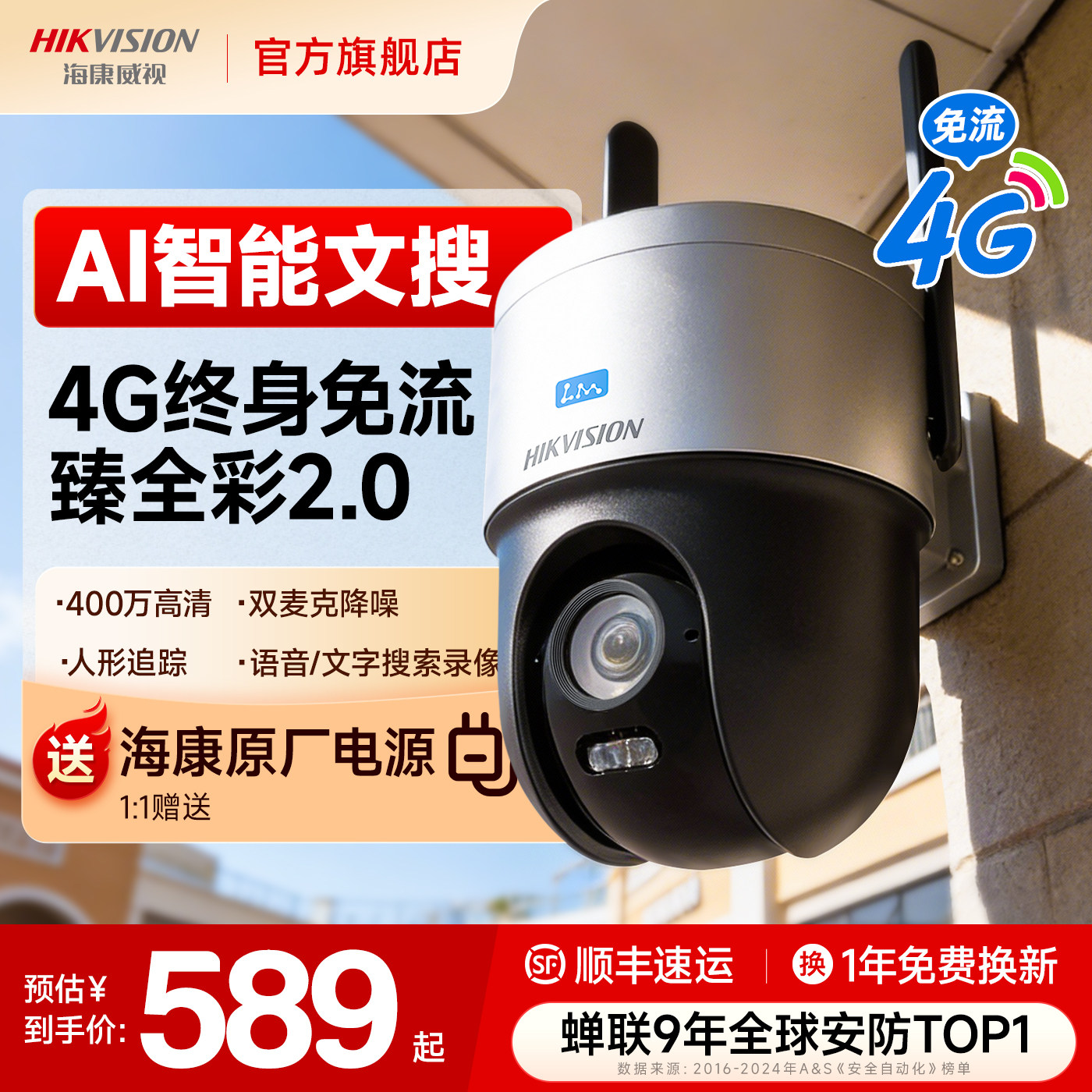 海康威视4G文搜臻全彩2.0监控器摄像影头家用户外360度手机远程