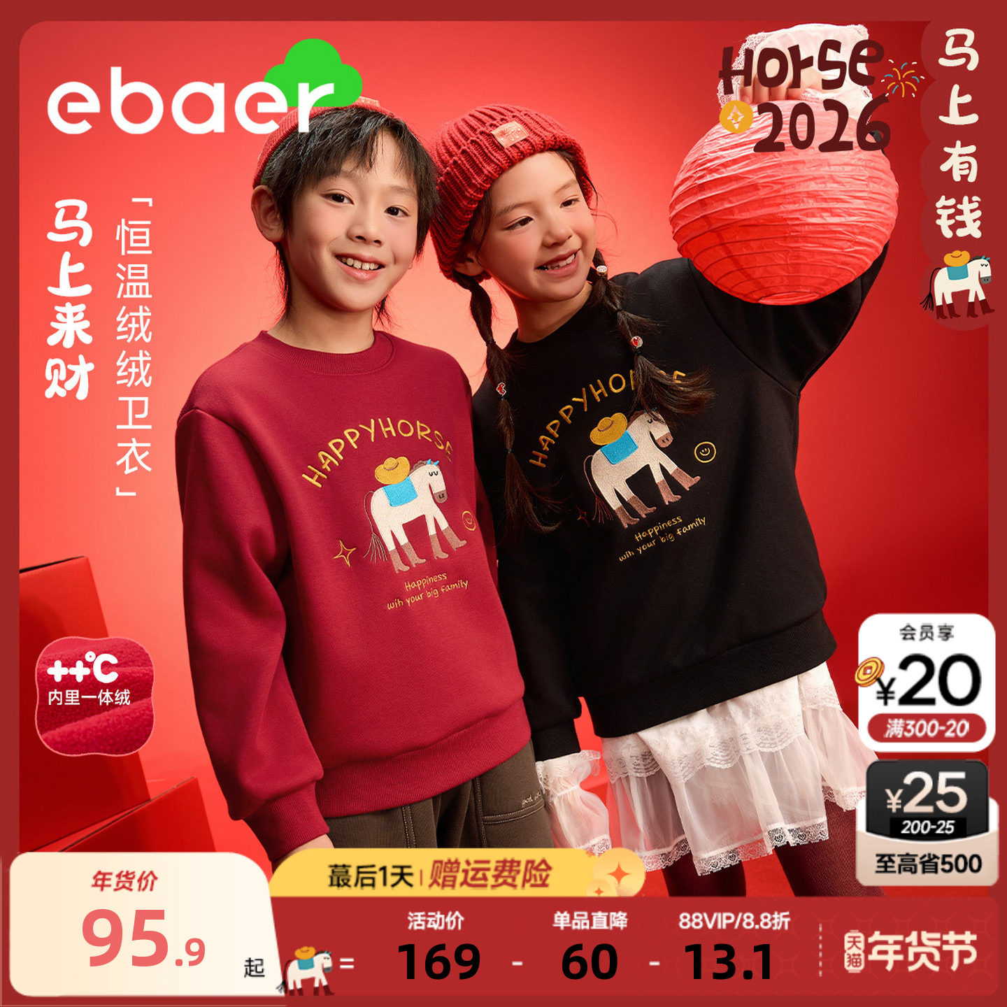 EBAER童装儿童加绒卫衣2026冬季新款男女童马年拜年服保暖红色潮