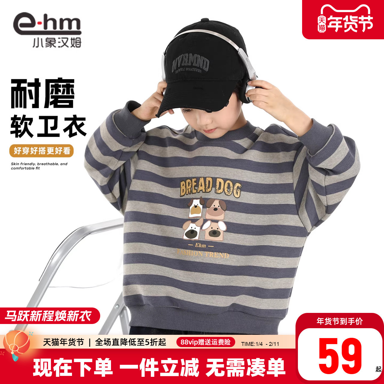 小象汉姆童装男童卫衣条纹儿童春春长袖打底衫2026春装新款上衣潮