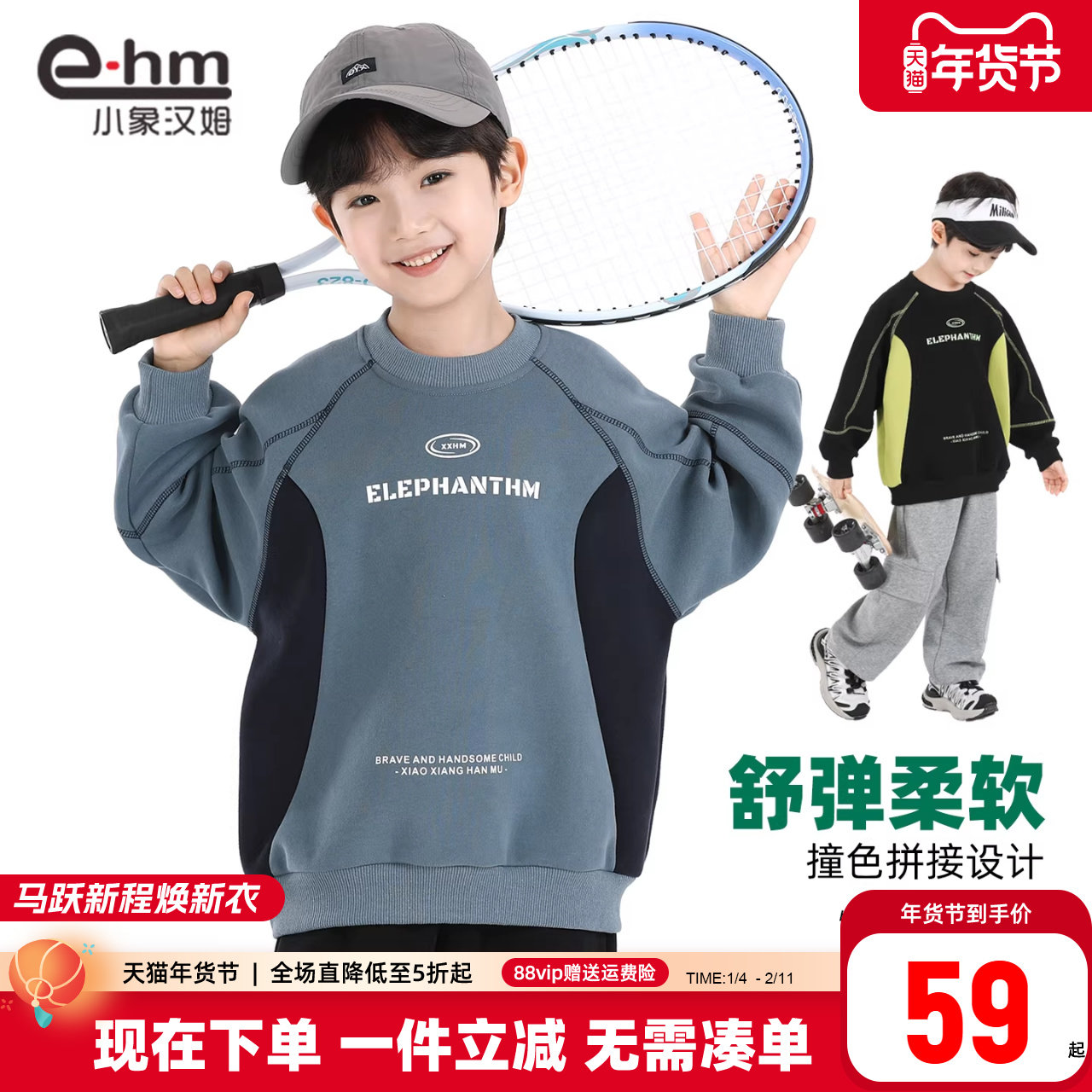 小象汉姆童装男童卫衣儿童圆领套头2026春装新款中大童洋气撞色潮