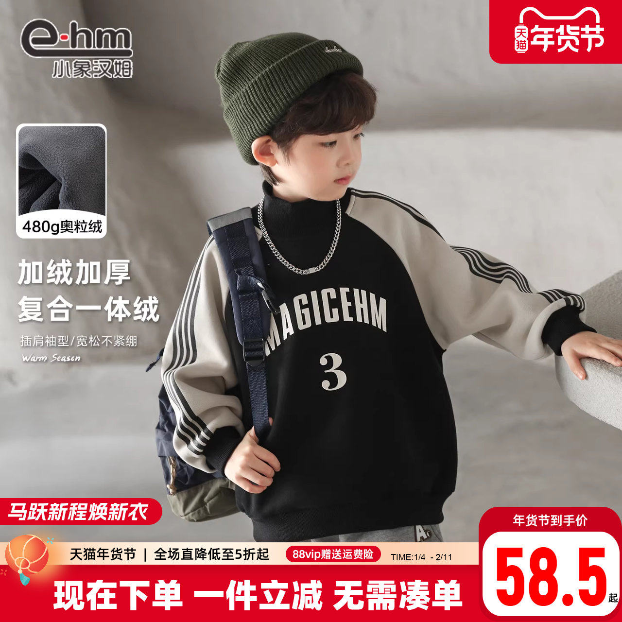 小象汉姆童装男童卫衣加绒半高领儿童一体绒打底衫冬装新款2026潮