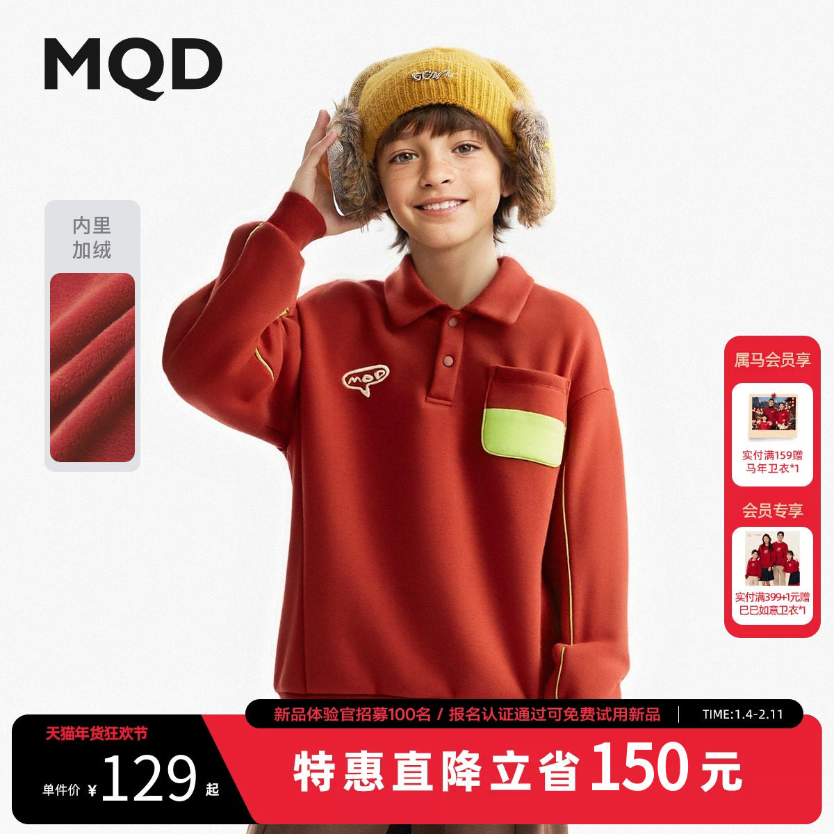 MQD童装男童加绒卫衣2025冬季新款儿童polo领红色休闲上衣内搭潮