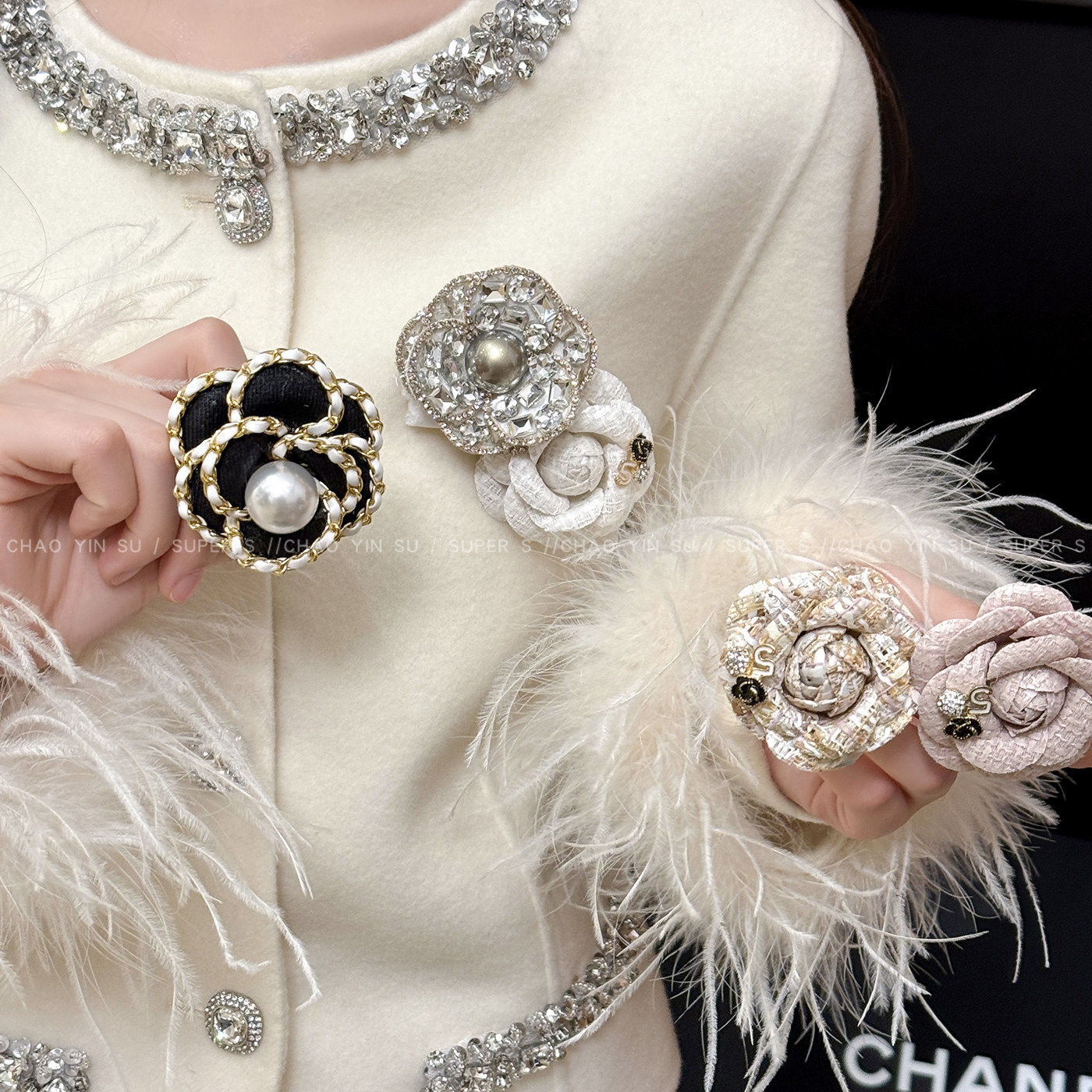 春夏复古山茶花胸针新款粗花呢尼布艺定型小香风胸花女外套配饰品