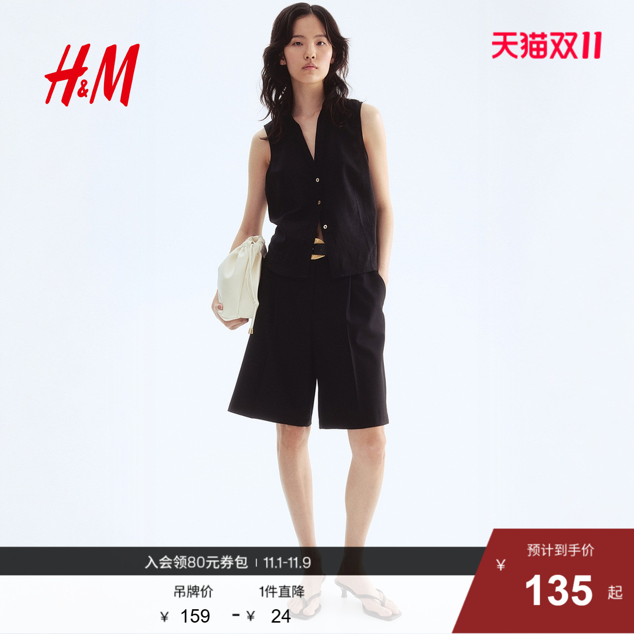 HM女装衬衫2025秋季新款亚麻混纺翻领通勤无袖修身V领衬衣1289990