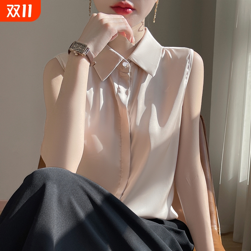 2025年夏新款醋酸真丝缎面翻领衬衫女宽松单排扣无袖背心内搭上衣