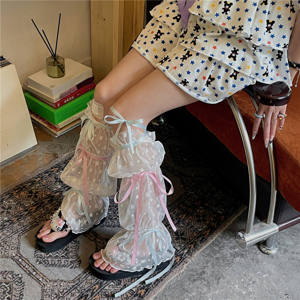 lolita蕾丝小腿袜子女法式丝带拼接蝴蝶结芭蕾袜套中筒网纱腿套薄