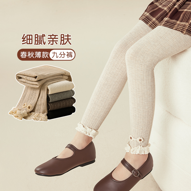女童春秋季纯色韩版九分裤女孩小花打底裤2025学生外穿花边打底裤