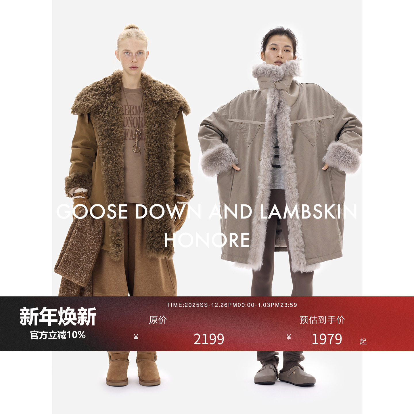 HONORE古月 重磅95白鹅绒 皮毛一体羊毛派克 翻领宽松羽绒大衣