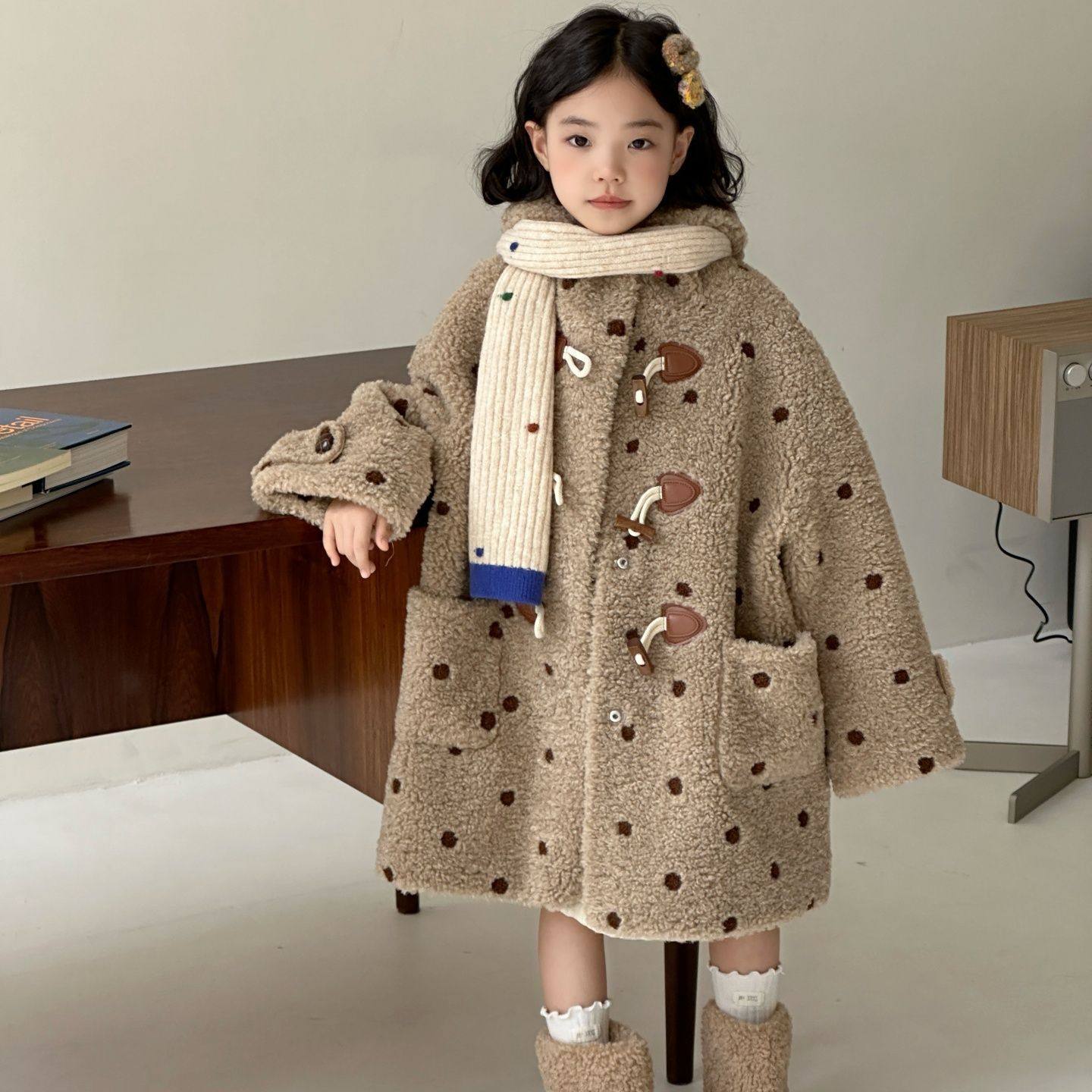 韩系秋冬新款女童皮草外套仿羊毛皮毛一体大衣中长款中大童连帽厚