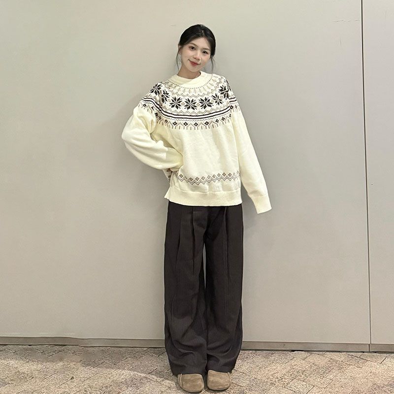 韩版慵懒风撞色提花费尔岛毛衣女学生冬季新款加厚宽松套头针织衫