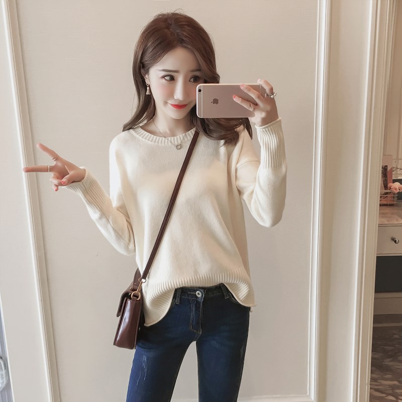 慵懒风奶白色套头毛衣女新款秋冬宽松学生长袖圆领针织衫韩版上衣