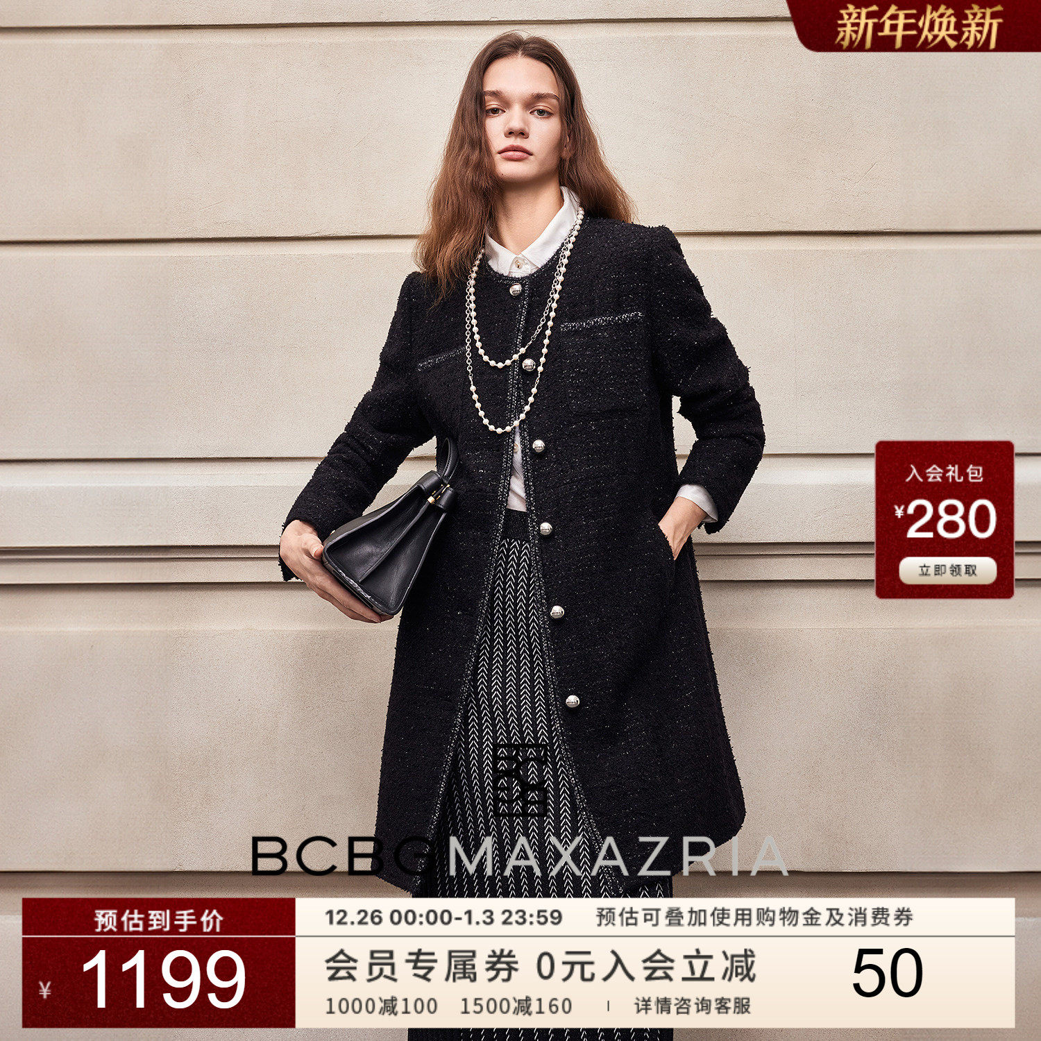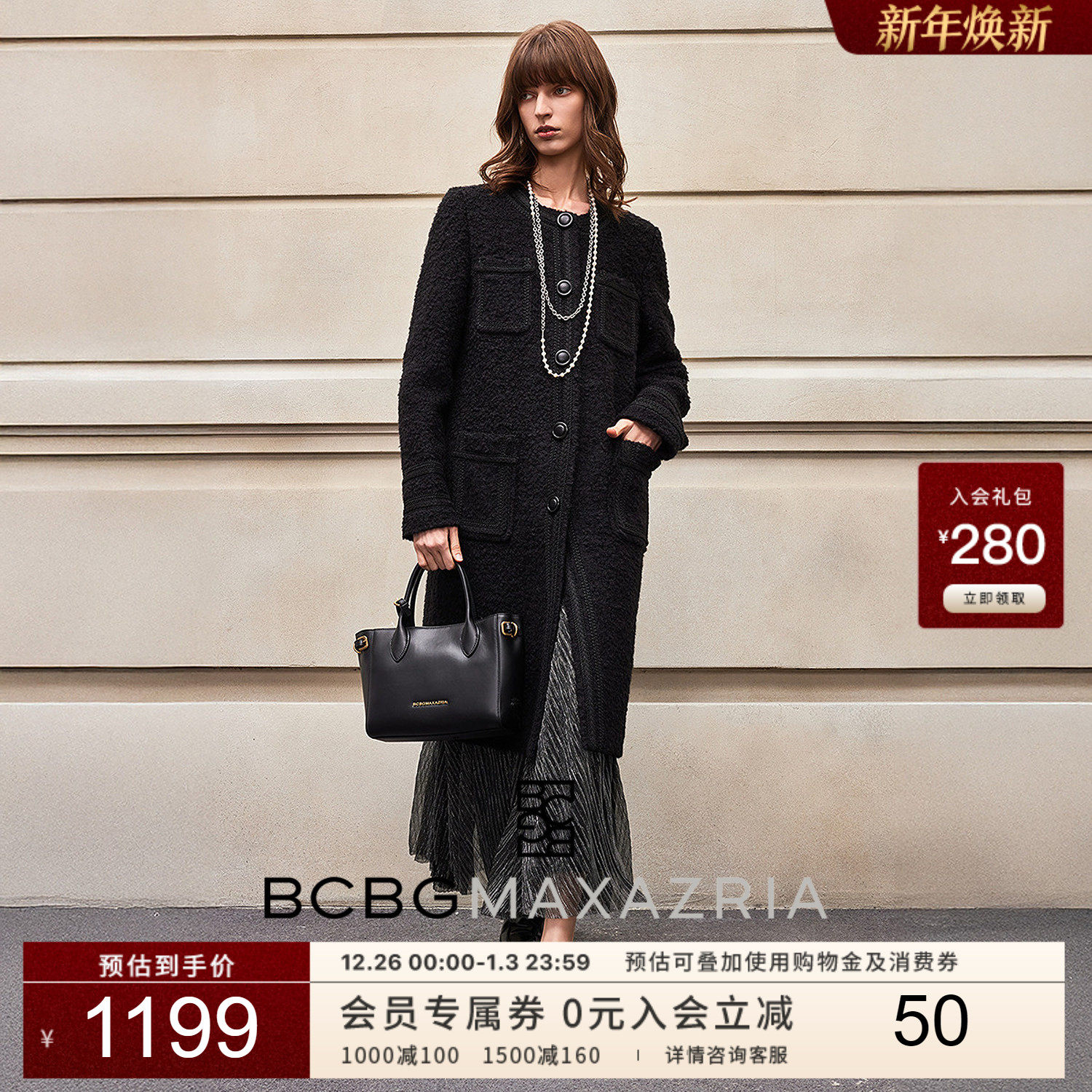 BCBG25冬新款时尚初剪羊毛混纺织带饰边金属扣亮丝粗花呢女大衣