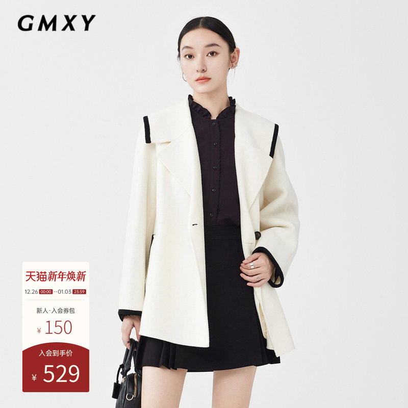 古木夕羊冬季简约纯色翻领立体裁剪双排扣全羊毛大衣女GS37005013