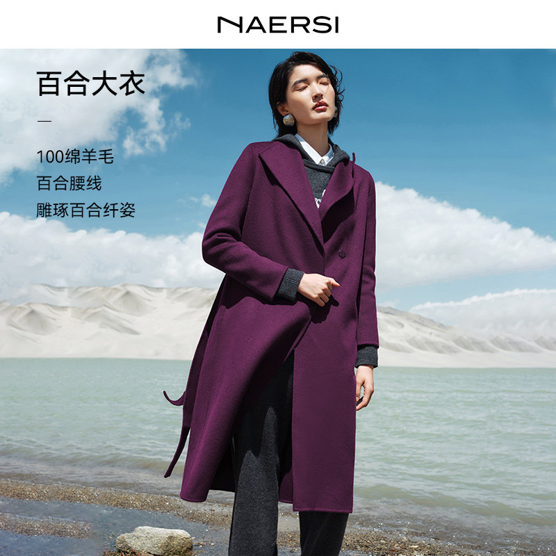 NAERSI娜尔思100羊毛双面呢大衣女冬季立体剪裁百搭紫红毛呢外套