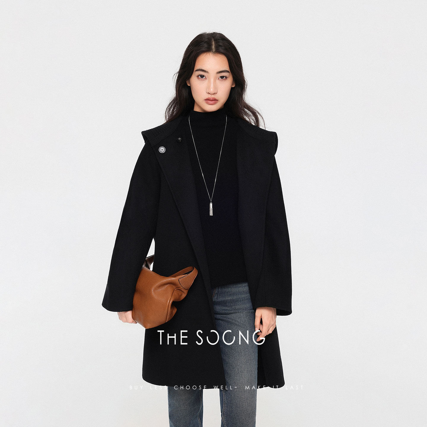 THESOONG/秋冬羊毛山羊绒立体裁剪中长款大衣连帽毛呢外套女8110
