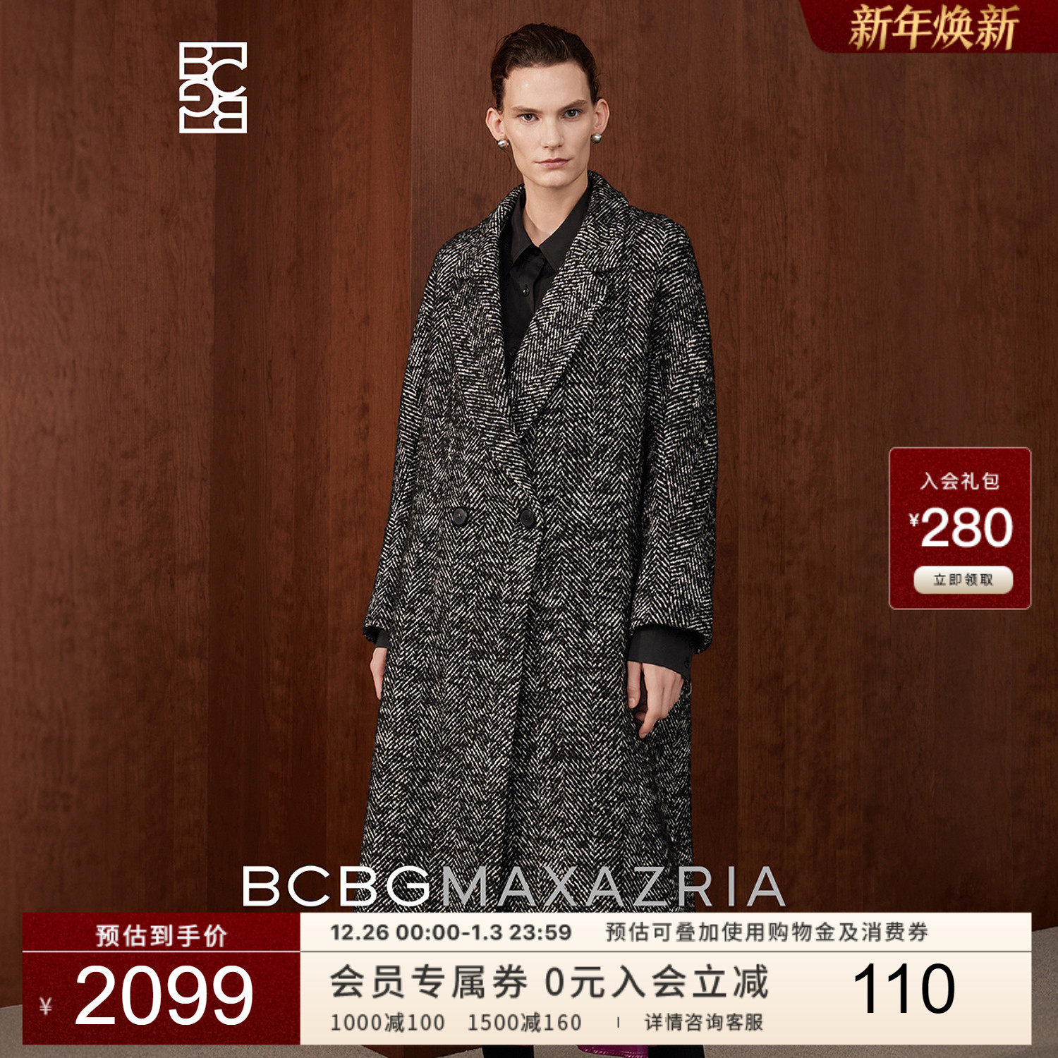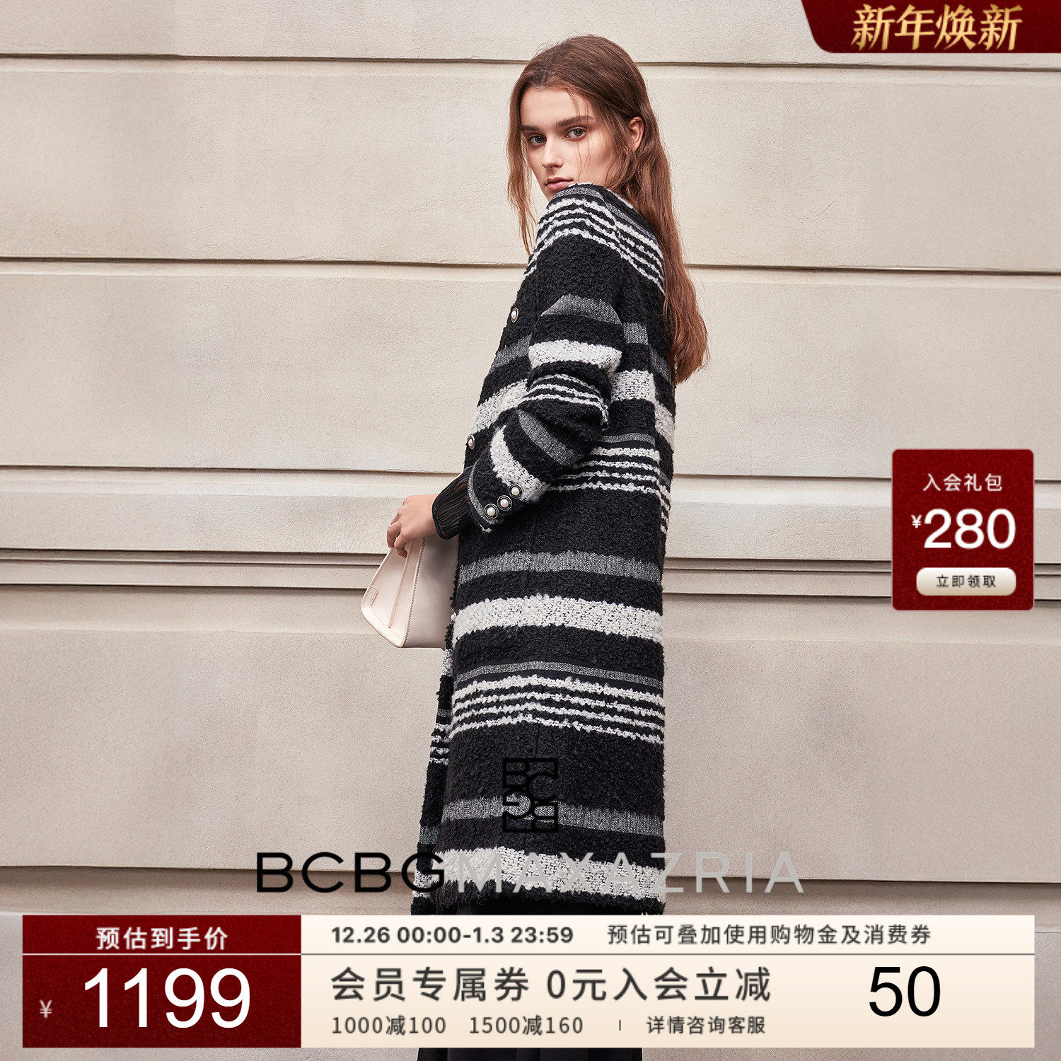 BCBG25冬新款初剪羊毛混纺黑白撞色条纹粗花呢中长款大衣女外套