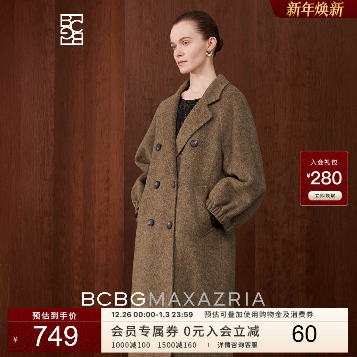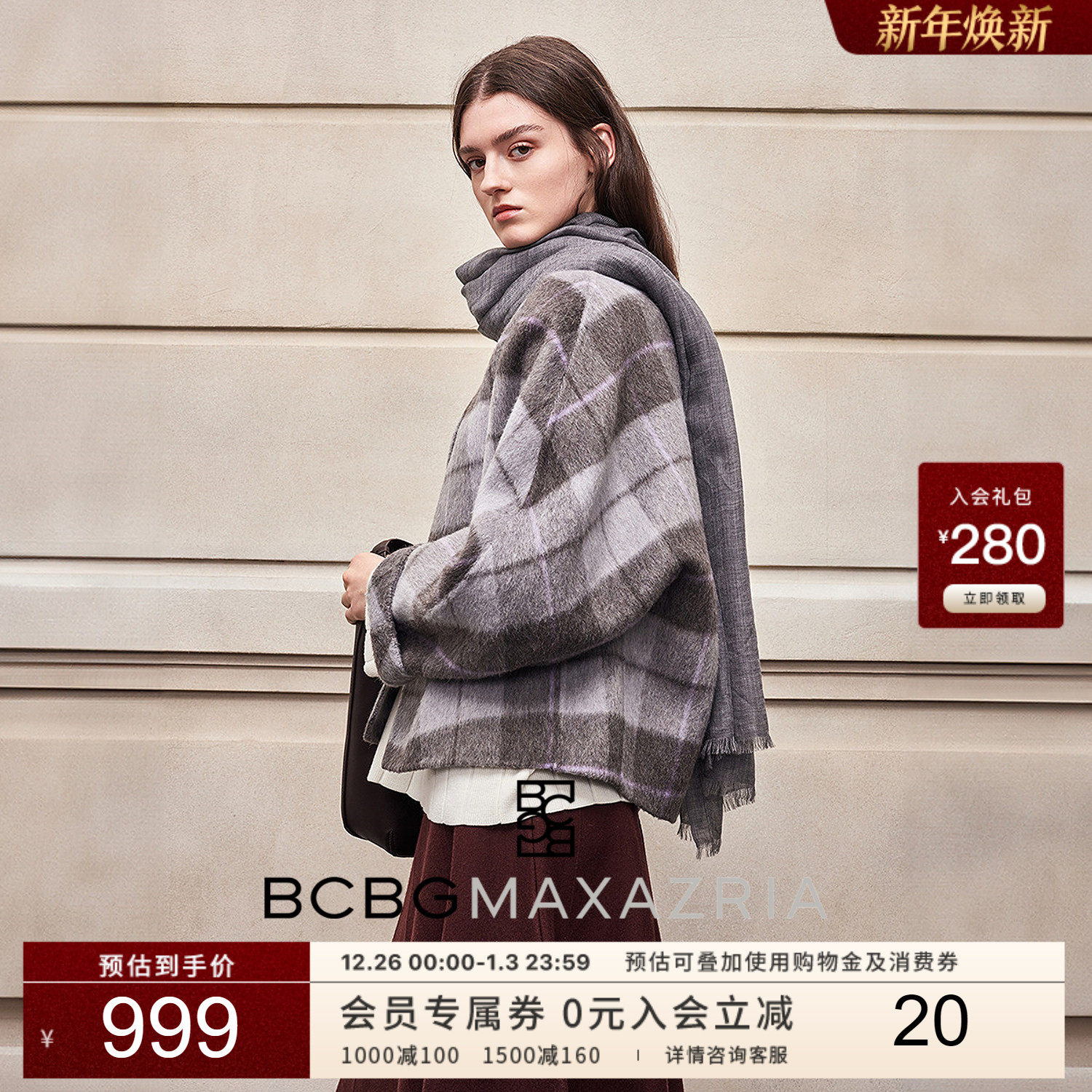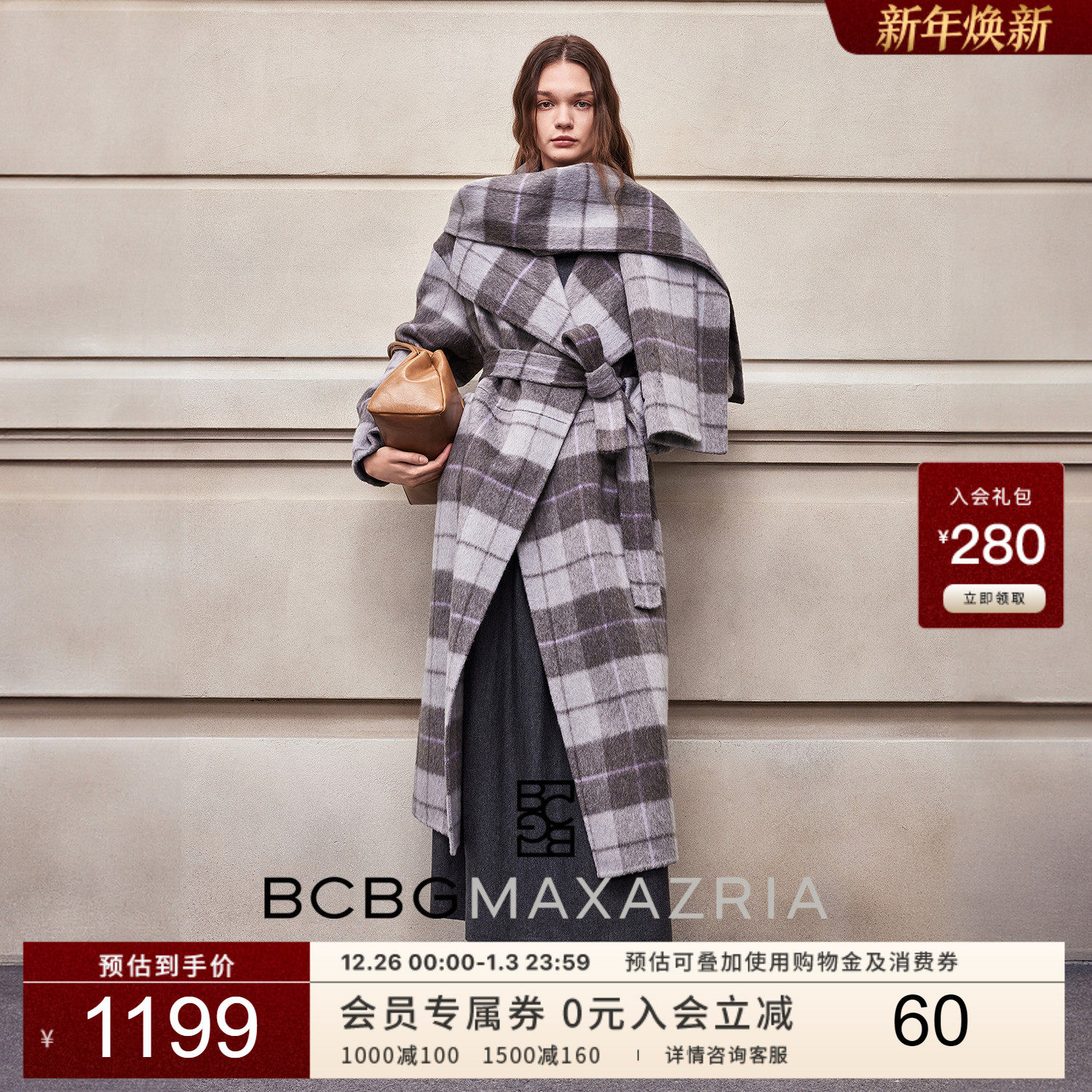 BCBG25冬新款优雅初剪羊毛混纺格纹大翻领收腰女士双面呢大衣