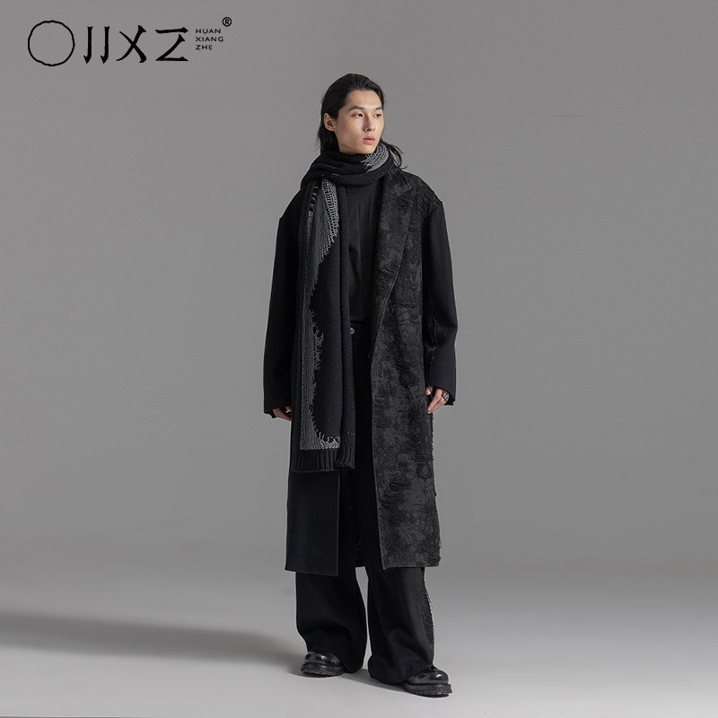 幻象者原创设计不对称剪花拼接羊毛风衣外套秋冬保暖大衣男女同款