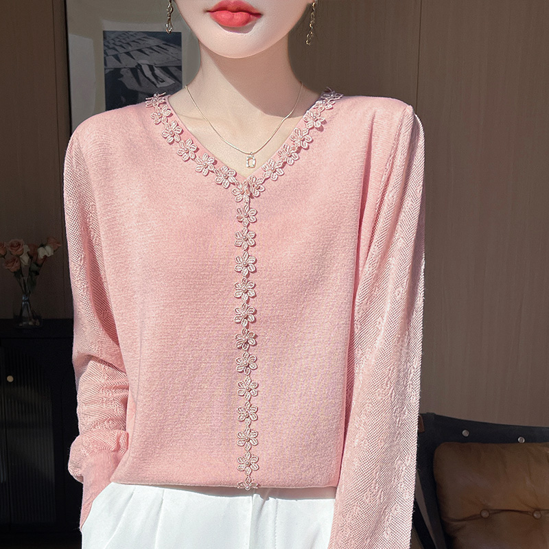 2025春季新款轻柔唯美绣花工艺宽松打底小衫女蕾丝镂空针织衫内搭