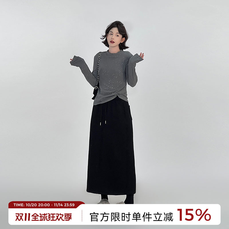 吴童童灰色圆领长袖小衫T恤女春季韩系高级感修身内搭打底衫上衣