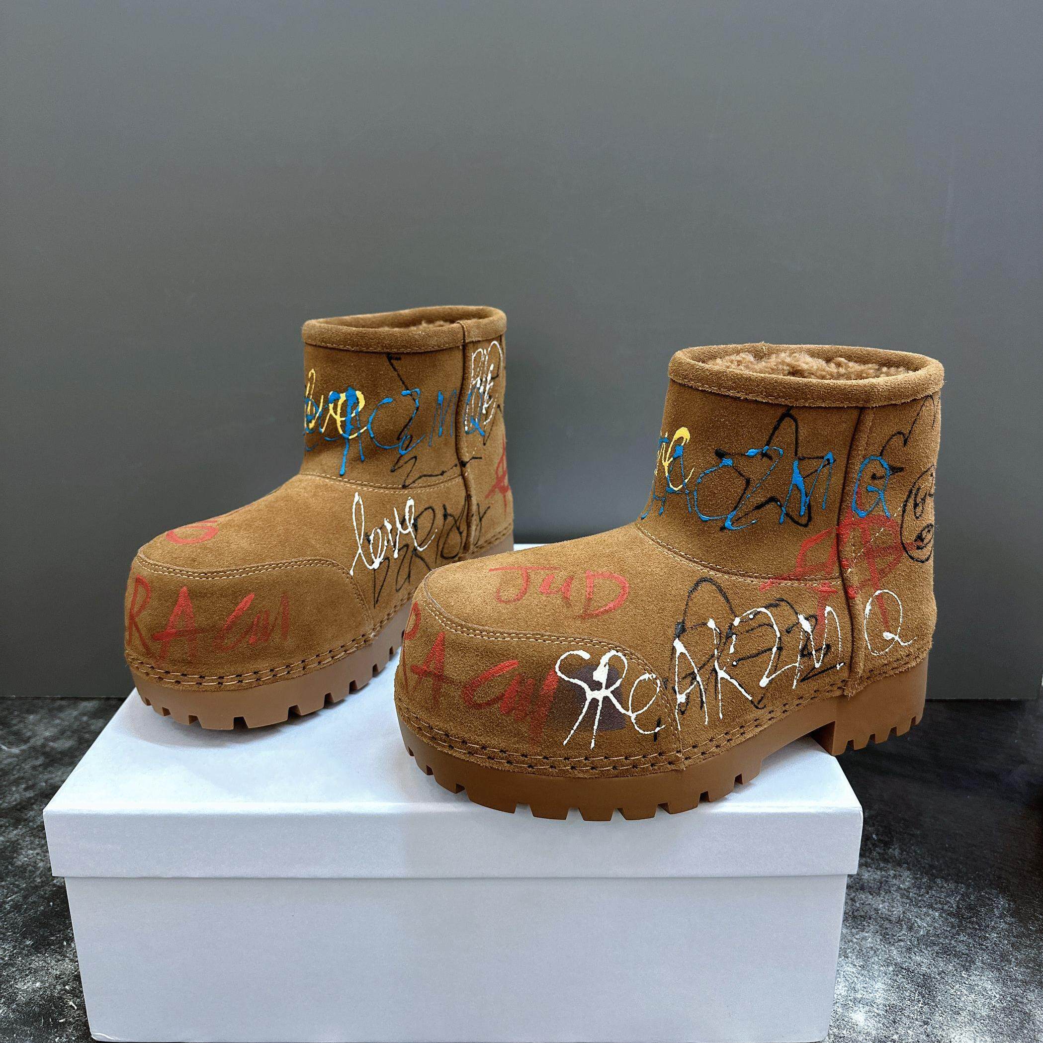 2025冬季新款米奇头涂鸦雪地靴女厚底短筒皮毛一体保暖棉靴欧洲站