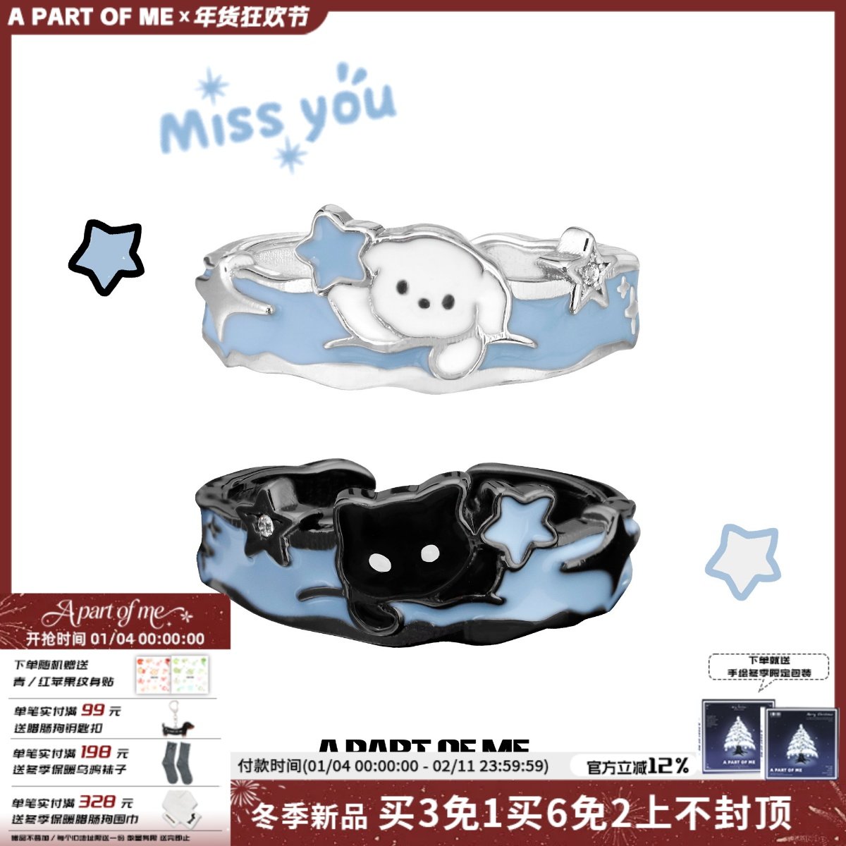 A PART OF ME雪中摘星的小猫小狗原创设计925纯银戒指情侣对戒