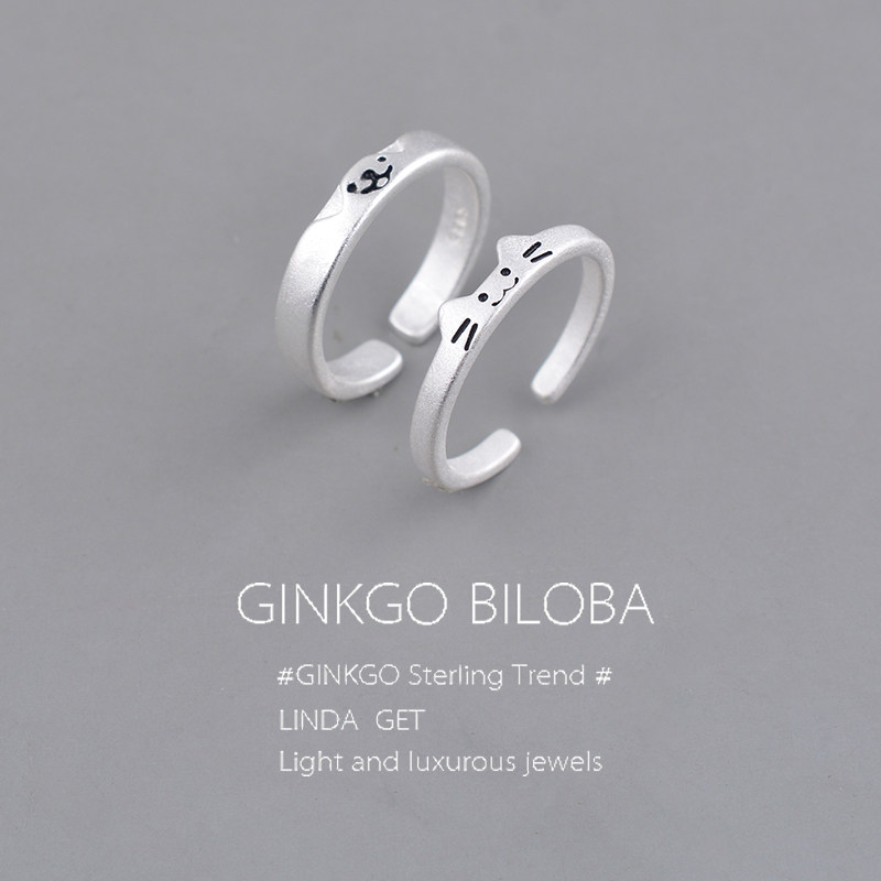 925纯银猫咪小狗情侣对戒女简约可爱开口戒指素圈指环送女友刻字