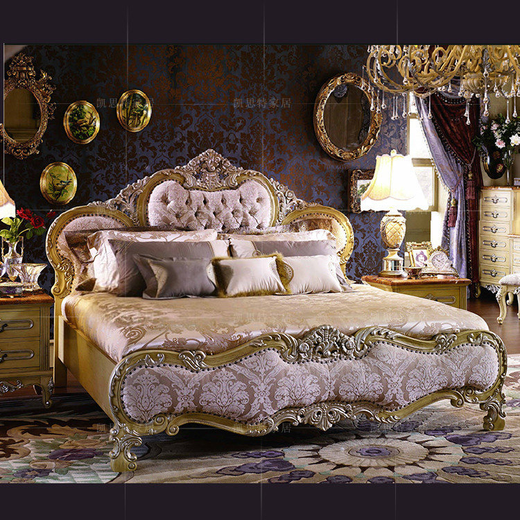 欧式双人床 1.8米实木床 布艺绣花床实木雕花床美式大床 描银大床