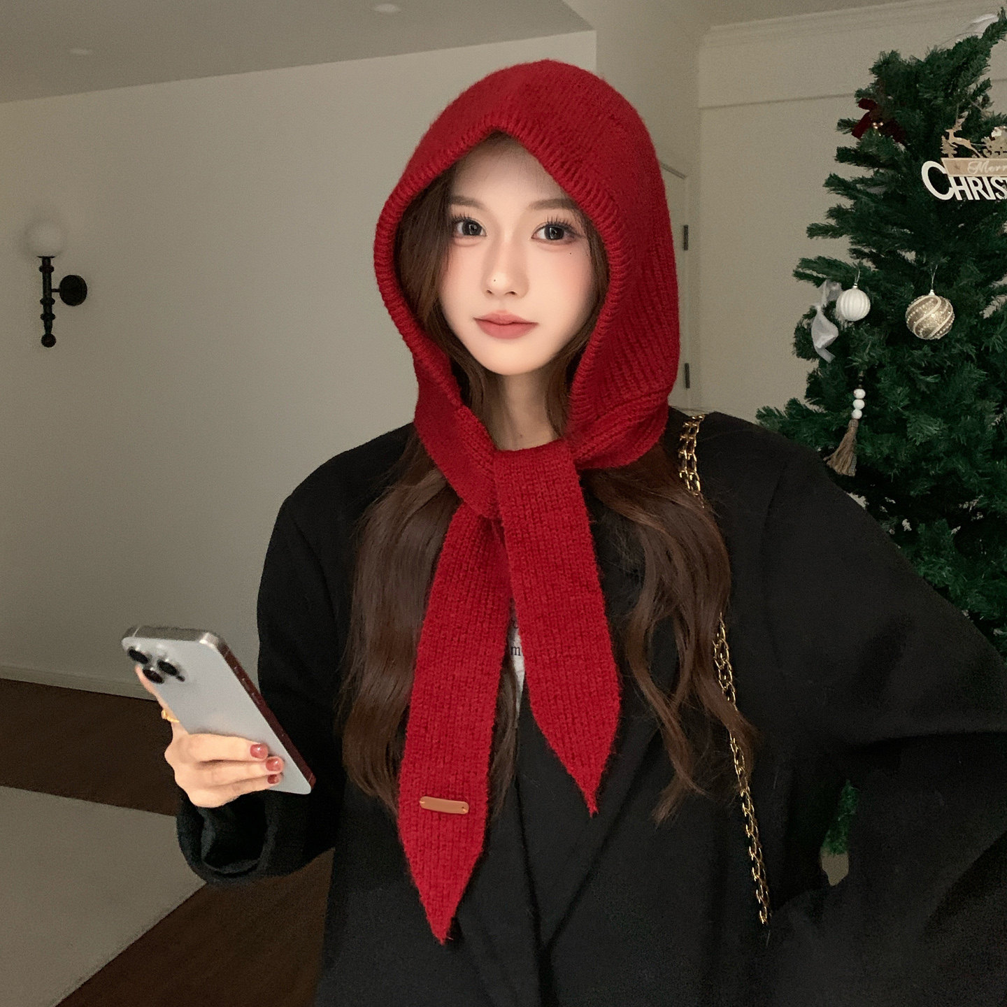 【张予曦同款】ALL BEINGS 25AW秋冬红色羊毛针织围巾连帽保暖女
