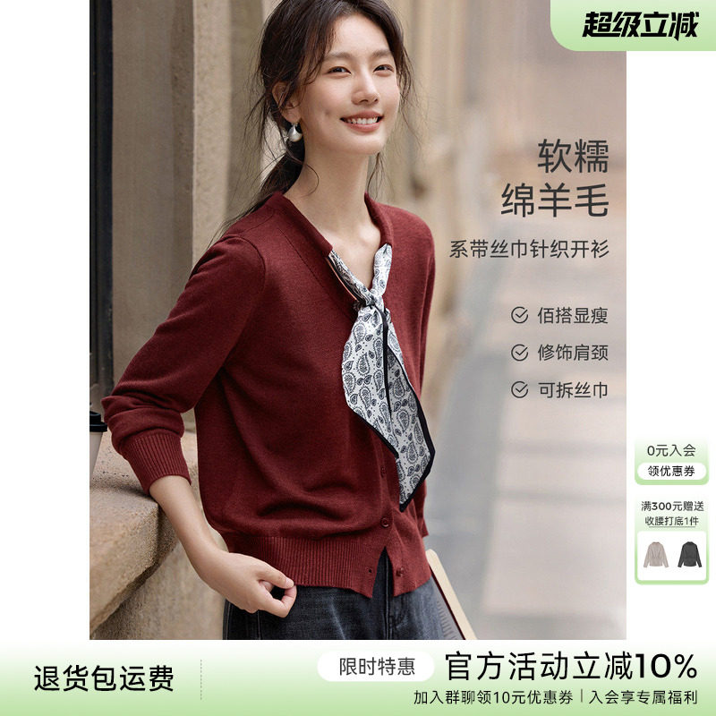 XWI欣未含羊毛丝巾设计感针织开衫女2025年秋冬显瘦百搭红色上衣