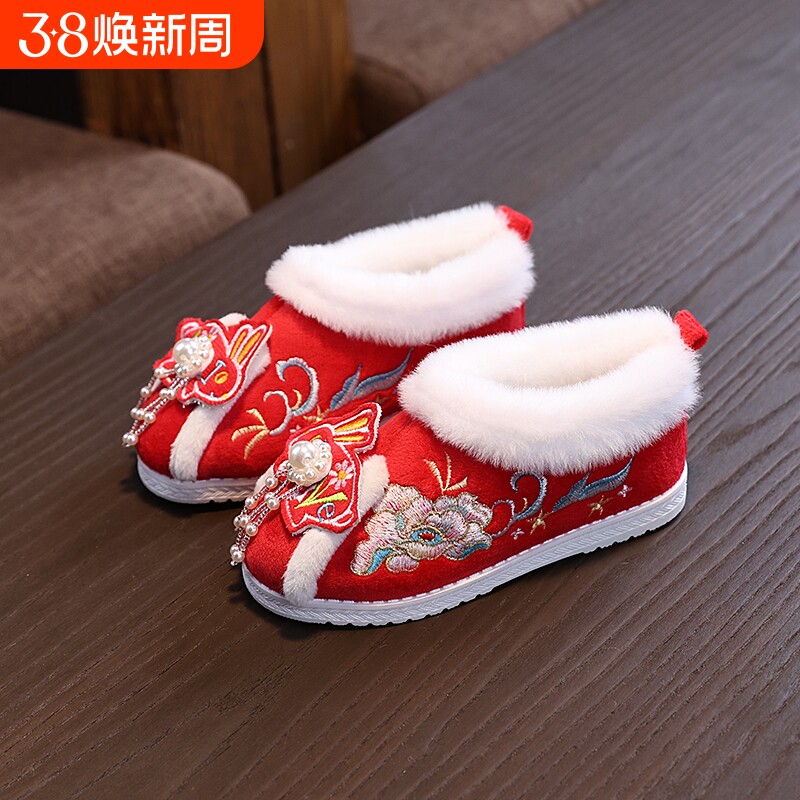 女童棉鞋2025国风儿童加绒汉服鞋女宝雪地靴加厚冬季大棉鞋鞋红色