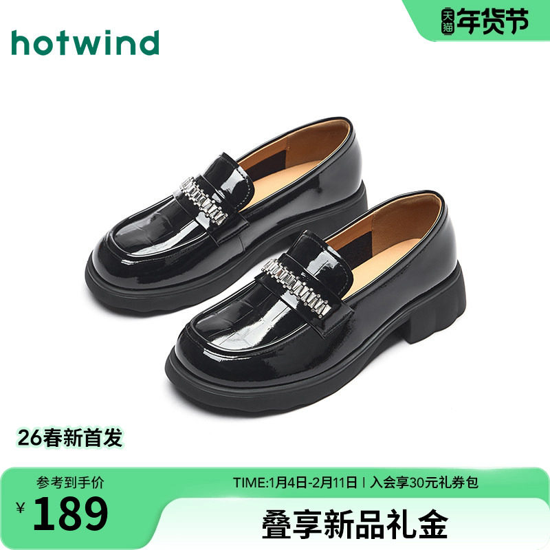 热风粗跟乐福鞋女鞋2026年春季新款女士黑色百搭单鞋时尚小皮鞋