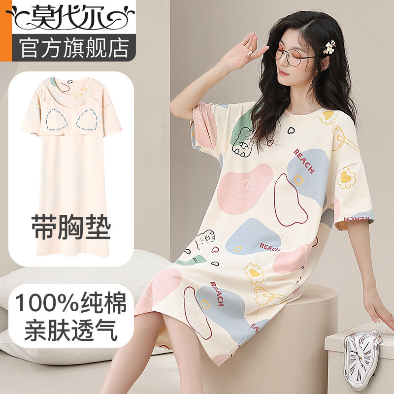 睡裙女士夏季纯棉短袖薄款带胸垫夏天2025新款妈妈夏款孕妇睡衣裙
