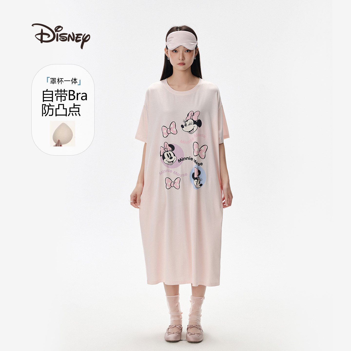 迪士尼米妮可外穿莫代尔棉卡通带胸垫宽松短袖睡裙家居服睡衣夏女