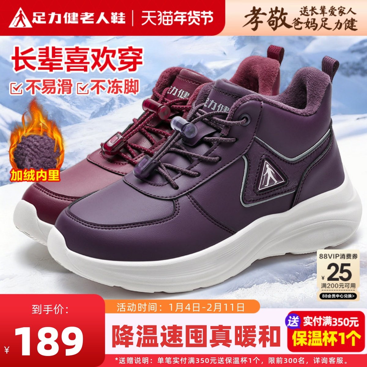 足力健老人鞋官方旗舰店正品女鞋中老年妈妈运动冬季加绒保暖棉鞋