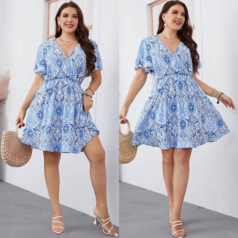 fat lady short dresses 夏款印花蓝色短裙大摆型大码气质连衣裙