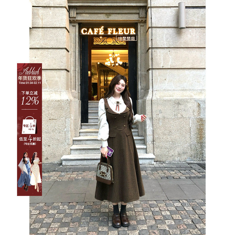 品牌折扣撤柜尾货复古日系灯芯绒背带裙女秋冬宽松大码气质连衣裙