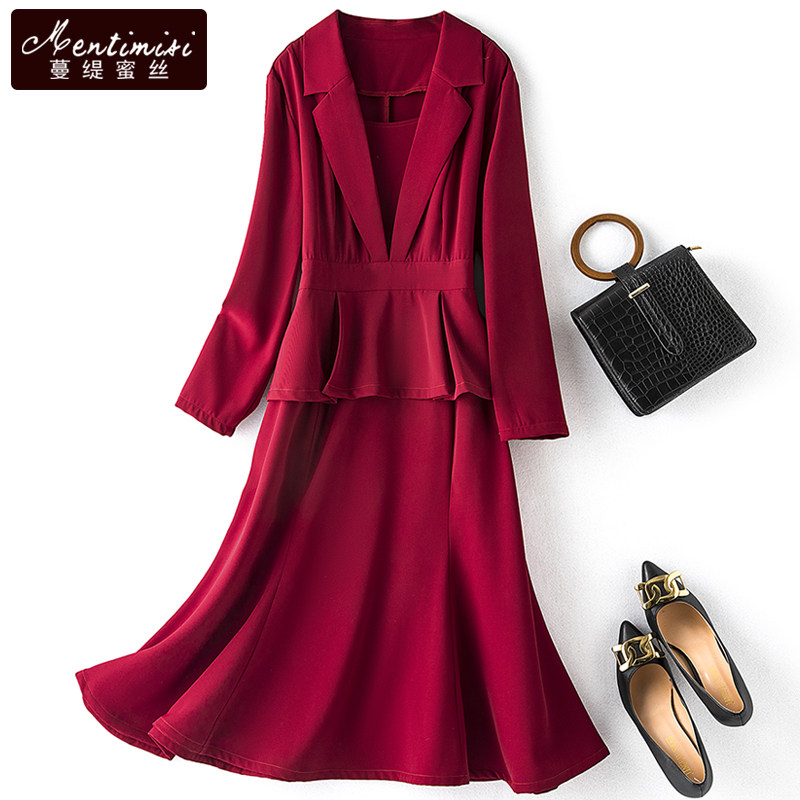 时尚气质优雅褶皱连衣裙套装春夏新大码显瘦西装外套背心裙两件套