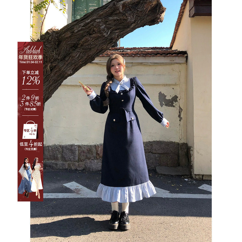 安妮不火 学院风条纹拼接裙子女2025秋冬新款微胖大码气质连衣裙