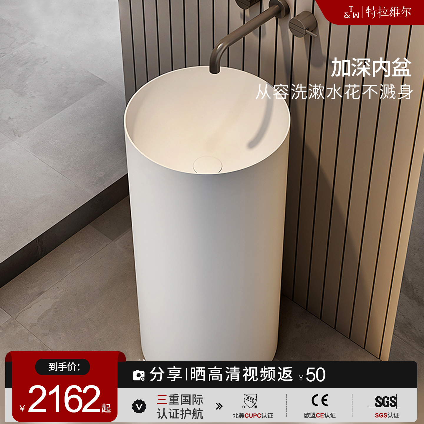 特拉维尔人造石洗手盆家用PMMA酒店圆柱立柱盆一体式卫生间洗脸盆