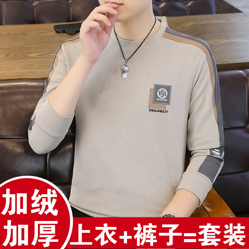 冬季圆领保暖内衣男加绒加厚两件套青年可外穿棉毛衫秋衣秋裤套装