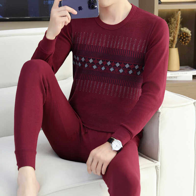 纯棉秋衣秋裤青年男士酒红色线衣线裤中年爸爸本命年保暖内衣套装